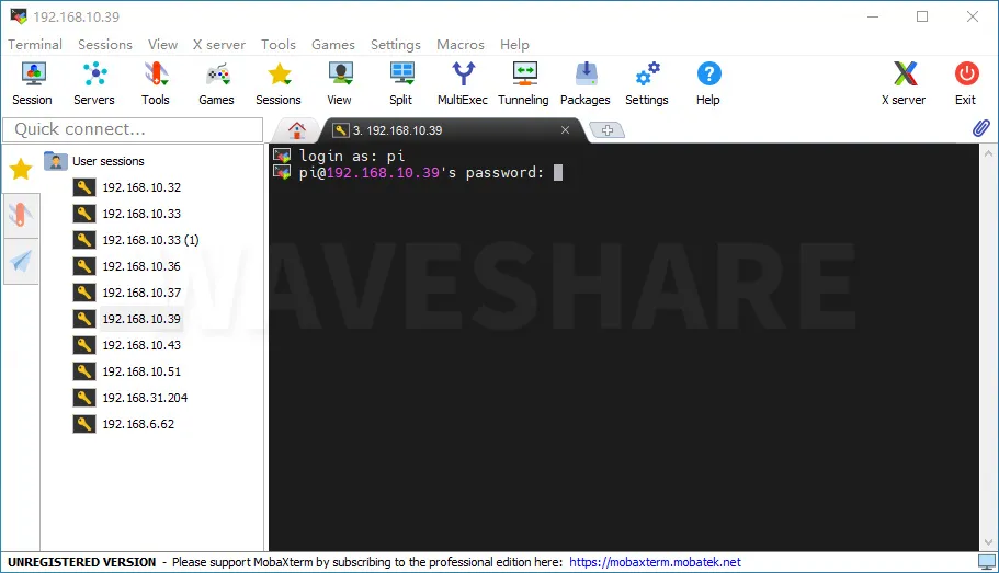 点击session,点击ssh,在Remote host输入树莓派的IP地址: