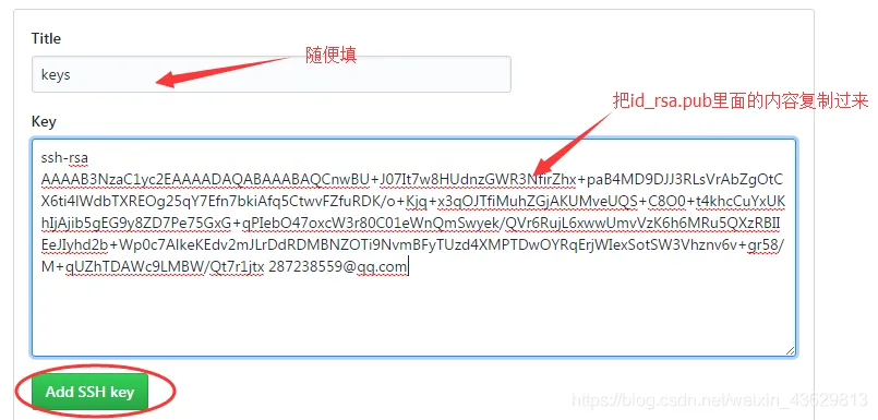 第二步:登录Github,找到右上角的图标,打开点进里面的Settings,再选中里面的SSH and GPG KEYS,点击右上角的New SSH key,然后Title里面随便填,再把刚才id_rsa.pub里面的内容复制到Title下面的Key内容框里面,最后点击Add SSH key,这样就完成了SSH Key的加密。