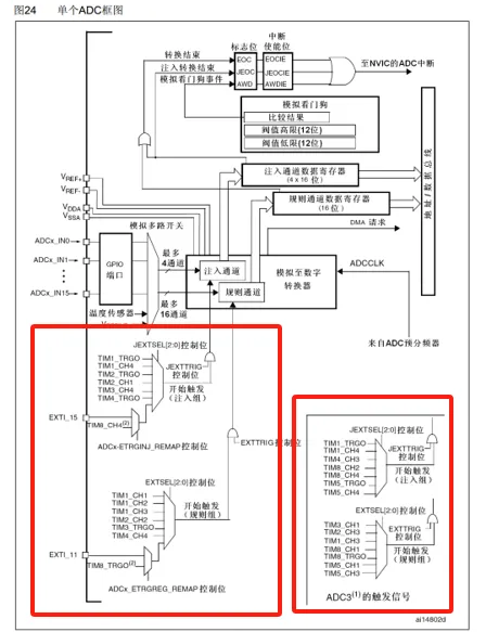 | 注入组: | ADC_ExternalTrigInjecConv_T1_TRGO//TIM1 TRGO ADC_ExternalTrigInjecConv_T1_CC4//TIM1 CH4 ADC_ExternalTrigInjecConv_T2_TRGO//TIM2 TRGO ADC_ExternalTrigInjecConv_T2_CC1//TIM2 CH1 ADC_ExternalTrigInjecConv_T3_CC4//TIM3 CH4 ADC_ExternalTrigInjecConv_T4_TRGO//TIM4 TRGO ADC_ExternalTrigInjecConv_Ext_IT15_TIM8_CC4//EXTI15和TIM8 CH4 |