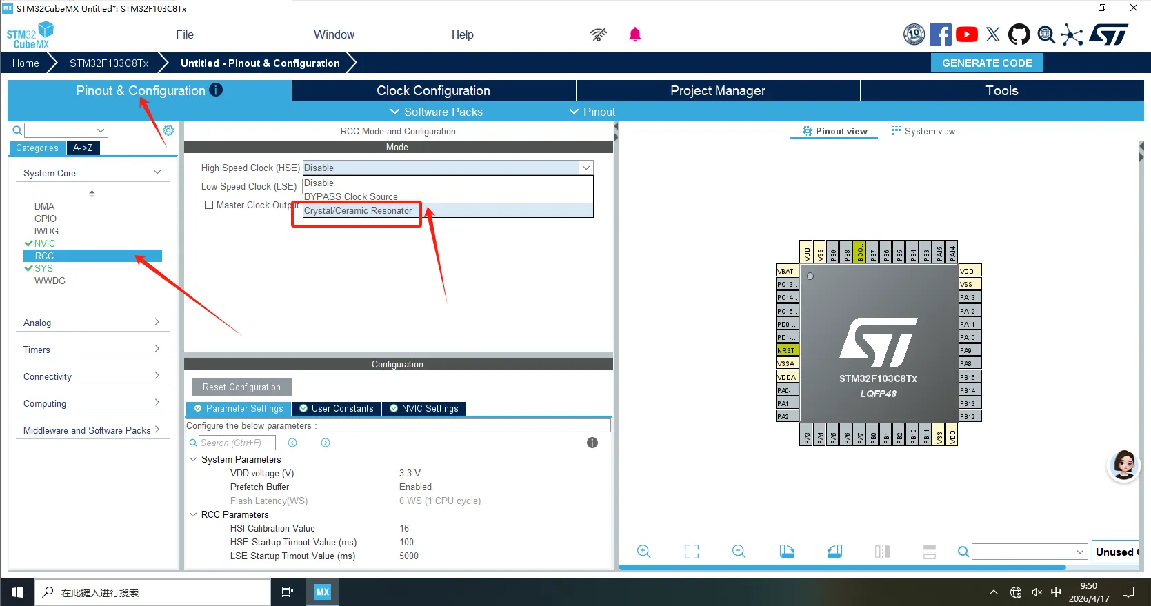 这里我们选择开启HSE选择Crystal/Ceramic Resonator