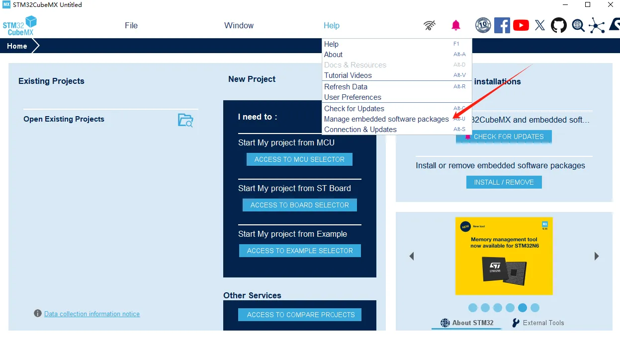 我们点击help然后选择 Manage embedded software packages