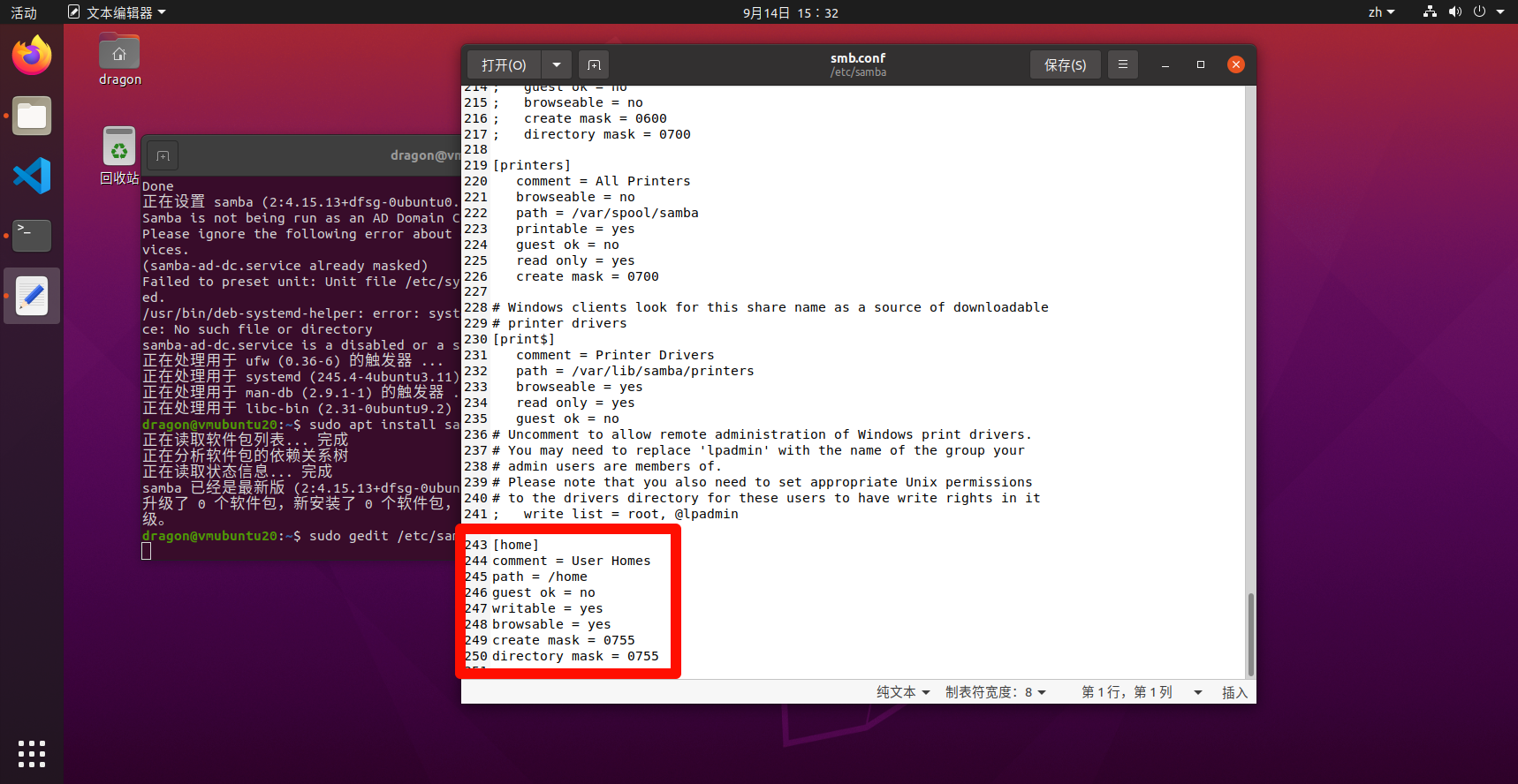 用于在开发环境中使用VS Code编写代码。执行下列命令安装samba并打开配置文件: