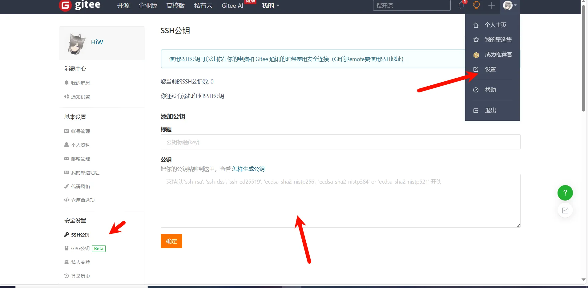 点击设置,点SSH公钥,粘贴刚刚复制的一大串东西