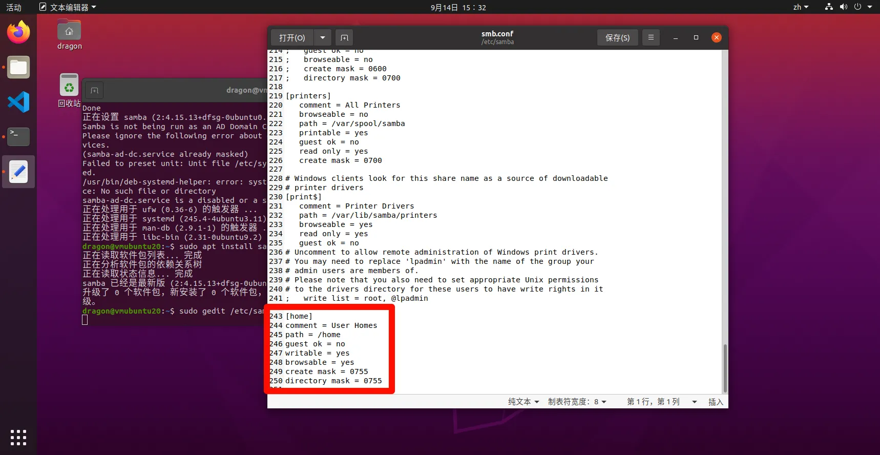 用于在开发环境中使用VS Code编写代码。执行下列命令安装samba并打开配置文件: