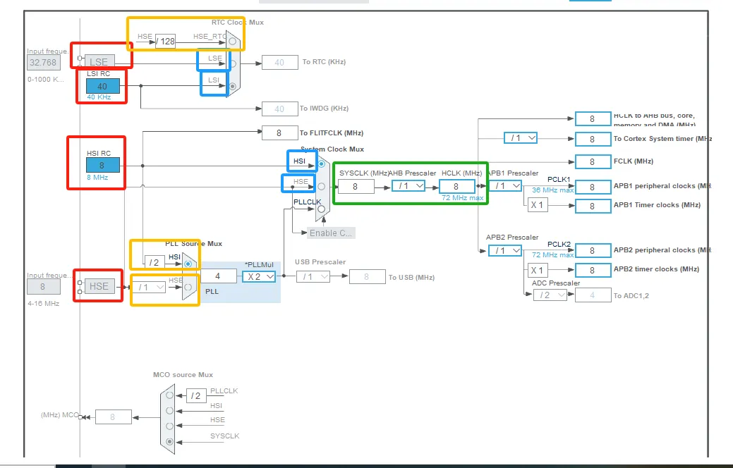 绿色:单片机实际运行时钟(F103c8t6最大频率是72Mhz)